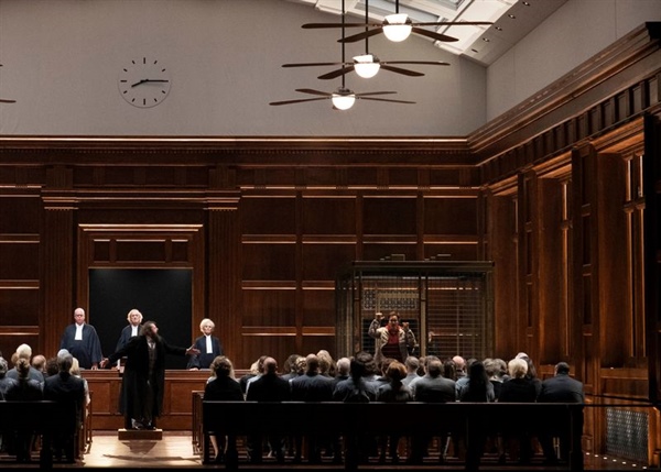 La propuesta de este afamado regisseur es una estructura escénica giratoria que muestra la sala de un Tribunal donde se desarrolla el juicio de Juana de Arco. El estrado y las bancas giran para mostrar ángulos diferentes en un movimiento en sí mismo atractivo por la forma en que la enorme masa decorativa de estrado, bancas, y muros en imponente boiserie gira sobre sí misma a través de las diferentes escenas de la obra. Pero lo que ocurre adentro es tan confuso como la mente de una heroína que el regisseur presenta como una subversiva visionaria impulsada a la autodestrucción por una sociedad implacablemente reaccionaria.