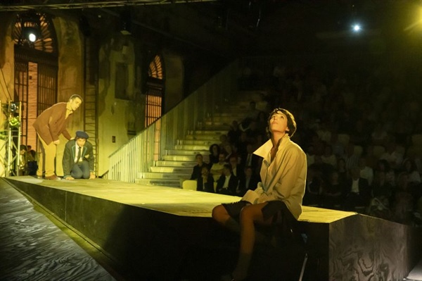 Curiosa o intencionadamente, se había escogido esta nave por su impresionante bóveda con una linterna de cristal, que podía evocar el gigantesco remate de la habitación fraterna, en la que se montaron dos gradas convergentes que miraban al escenario, este a su vez de estructura cuadrangular, dividido diagonalmente en dos partes inclinadas (hay que tener una edad o forma física para correr en ellas, que lo hicieron) por una especie de pasillo recto que culminaba en un remate que podía recordarnos el de un gran féretro alargado, tal vez anticipándose a la muerte desde el principio. Diversos compartimentos escamoteables servían para ocultar sus camas o guardar los ‘tesoros’ y que completaban la escenografía de Juan Ruesga. Elisabeth era el personaje que más salía al ‘exterior’, al mundo, así que un vestuario muy nutrido y muy cuidado encajaba con cada situación, incluyendo la evocación de la boda, un trabajo de vestuario de Nino Bautí.