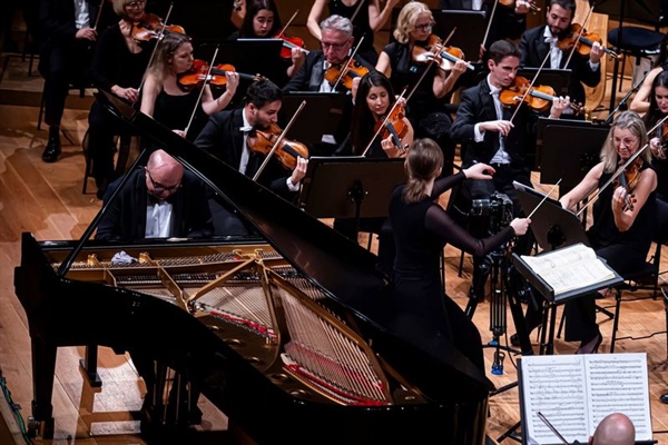 El Concierto nº 1 de Chaikovski fue el gran éxito de la noche en cuanto a interpretación, al juntarse temperamento, dominio absoluto de la partitura, mecanismo infalible, virtuosismo y capacidad dinámica del pianista, con el impulso juvenil y claridad de la Directora, que hicieron la versión muy fuerte, marcada y de rítmica variada, con el Allegro non troppo e molto maestoso inicial un punto más “demasiado” y menos “majestuoso” que su mucho metal propone, lo que obligó a que las relaciones posteriores fuesen lastradas por ese ímpetu aunque, eso sí, plenas de pasión. El segundo movimiento nos pareció el más redondo, con el Andantino (inicio pianísimo en pizzicati unido de cuerdas y bien flauta, maderas y cello para unas líricas flautas) y un contrastado prestísimo que, tras la recapitulación, llevó a desbordante coda conclusiva; se enlazó con el con fuego final, que lo tuvo, con nota para los 2 cellos, oboe y violas. La OSCyL estuvo sobresaliente porque, acompañar y plantear lucha con el piano en tales condiciones de contrastes, sin tacha, es muy difícil y lo consiguió plenamente conjunta y afinada hasta el final, colaborando, con solista y Directora, a que la Sala explotase en atronadoras ovaciones, que se repitieron cada salida y saludo que los intérpretes hubieron de hacer. Alexander Gavrylyuk las agradeció por su parte, tocando muy lírica, sentida y romántica melodía amplia, que volvió a refrendar su gran éxito anterior.